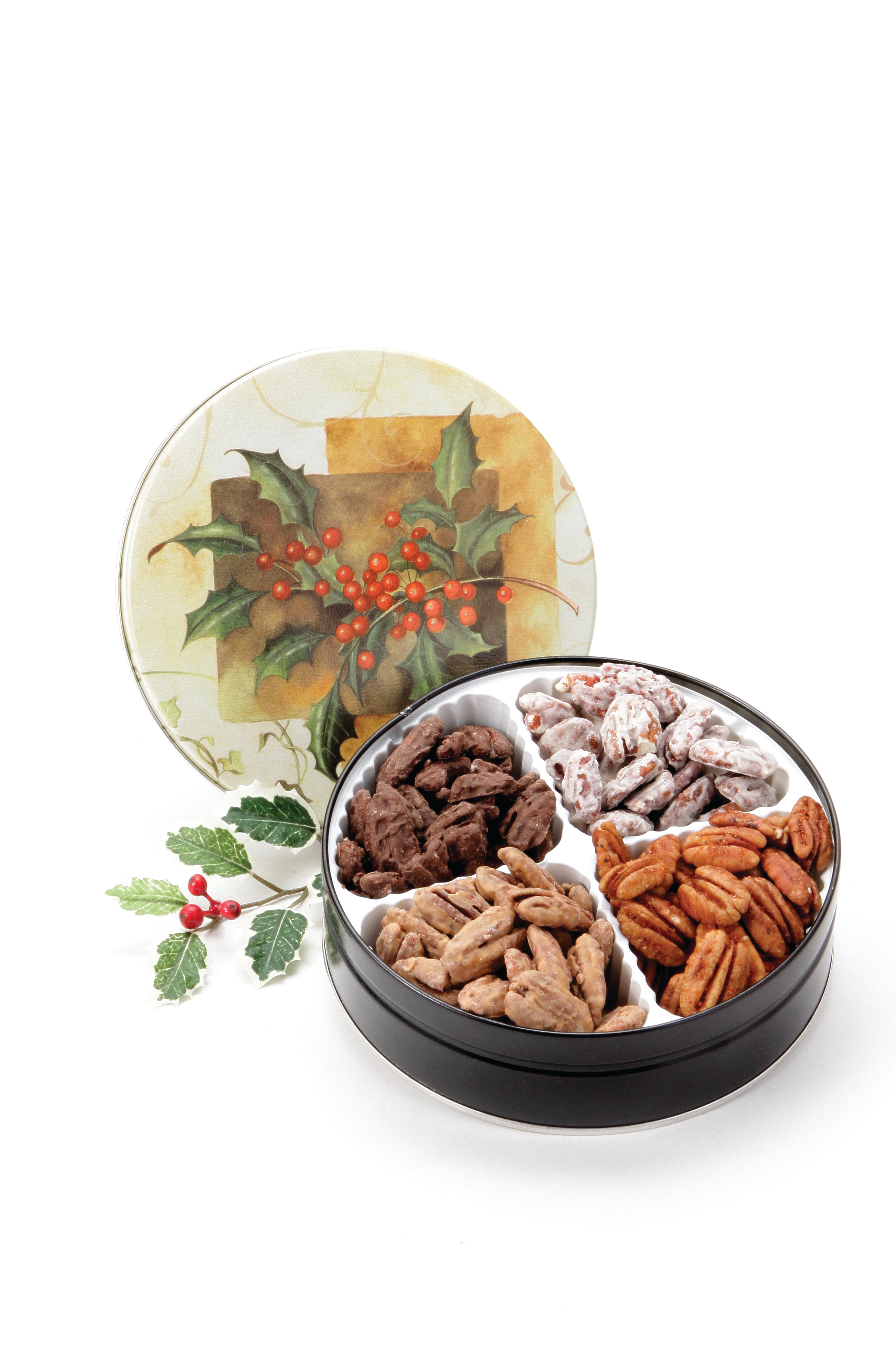 Fancy Flavored Pecans packed in a tin. This item is year-round, packed in a tin appropriate to the season. Four flavors include: