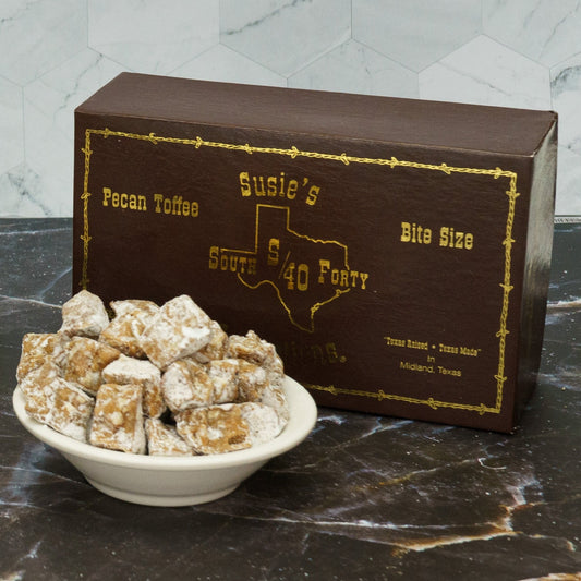 Susie's handmade toffee is full of fresh pecans and rich creamy butter. Each fabulous bite is coated with rich, pure Belgian chocolate then topped with powered sugary goodness.