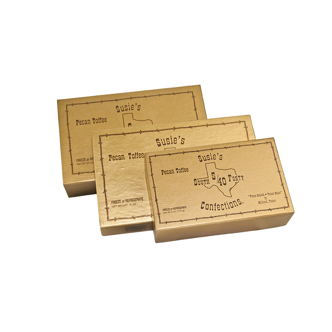 Susie's toffee is a dairy confection. We have found - and our customers agree - that enjoying it frozen is the best! All of Susie's toffee is made without preservatives and MUST be stored in the freezer of refrigerator. Store in the freezer even before opening in the original box. This will ensure it stays fresh up to a year in the freezer and up to three months in the refrigerator.