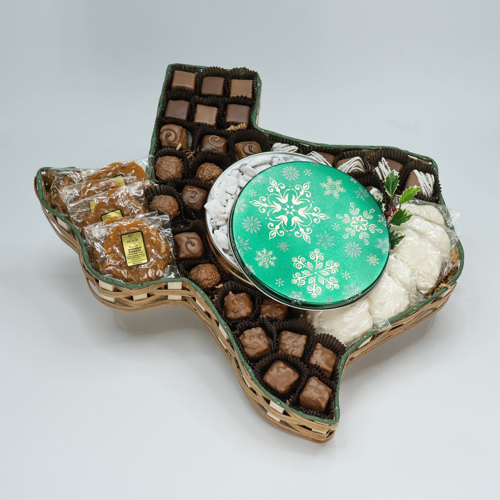 This Texas Basket with a tin (logo or holiday) that is custom screen-printed with your company's logo. Your customers/clients are sure to savor Susie's sweet treats. Choose between filling the tin with 24 oz. Pecan Toffee® or 16oz Texas Trash®.